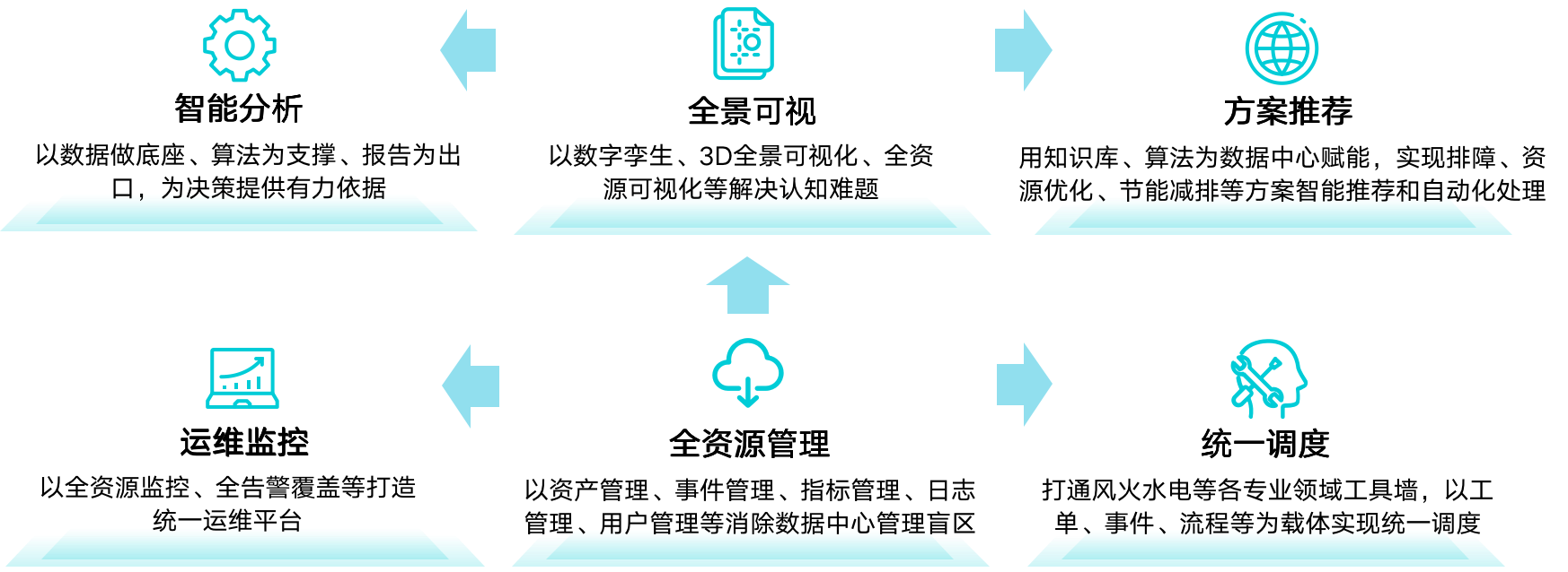 此外,通过众多落地案例,云智慧总结了数据中心运维过程中最有代表性的六大场景,包含全资源管理、运维监控、统一调度、全景可视、智能分析、方案推荐。下面我们将对相关场景做详细介绍: