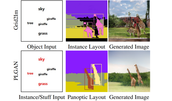 Figure 1. Scene-to-image synthesis by Grid2Im [1] vs. PLGAN