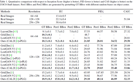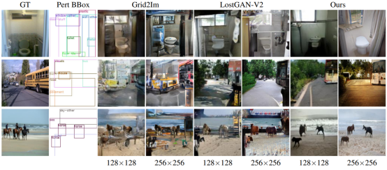 Figure 4. Visual comparison between sample images generated from perturbed BBoxes (Pert BBoxes) on the COCO-Stuff dataset