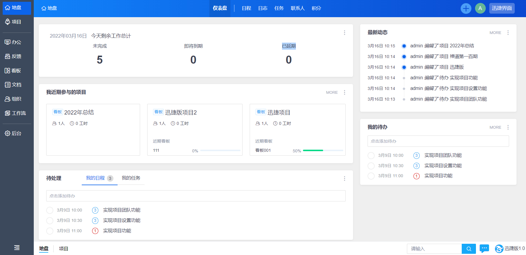 - 迅捷界面提供了项目管理、办公管理、看板管理、文档、组织等功能。