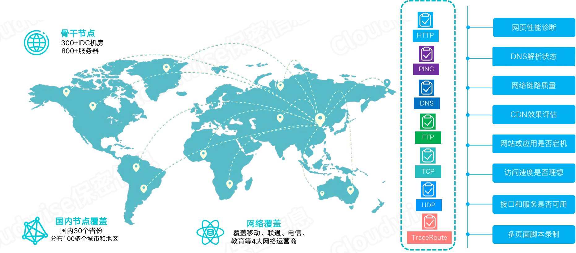 云智慧拨测产品监控宝提供7*24小时主动IT性能监控;产品在全球范围内大概有 300 家的 IDC 节点,提供 800 家的服务器,IDC数量决定了数据反馈的全面性,可以有效保障业务在全球的用户体验;国内节点覆盖30多个省份和100多个城市和地区,更能精准的定位问题所在区域。此外,也较为全面的覆盖了多个运营商,包括移动、联通、电信、教育四大运营商。以上三个维度,可以看出云智慧监控宝产品可以为各行业企业提供业务保驾护航的能力。