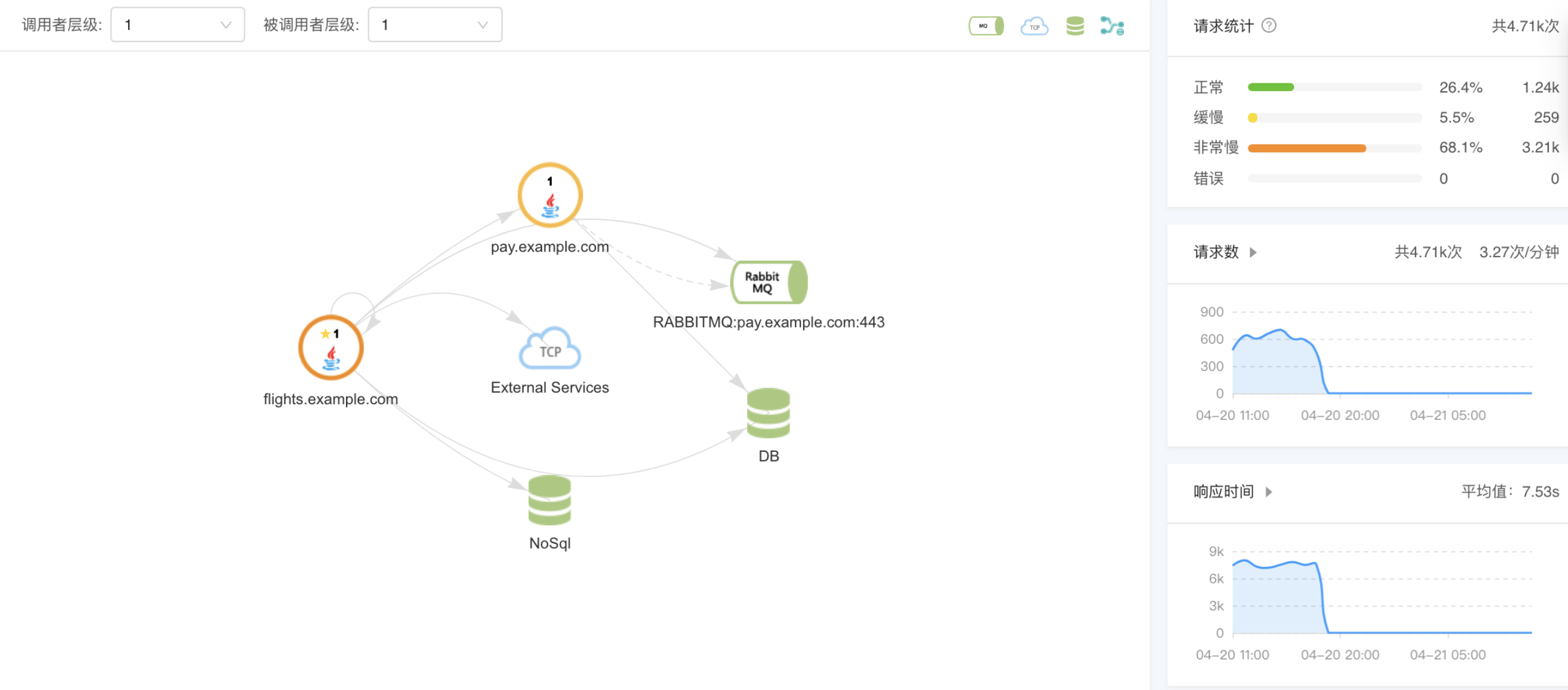 随着企业应用上云和容器微服务化,应用之间调用关系愈来愈复杂。全局拓扑自动发现与监控是通过将复杂的请求调用关系拓扑图化来帮助运维人员和业务开发人员快速定位性能问题。产品可以直观的通过颜色变化分辨出是缓慢问题还是错误问题。同时拓扑上能发现各个组件的调用情况以及自身应用访问的组件,数据库、MQ、Nosql 和 API 接口情况。此外,通过拓扑可以直观的判断是自身应用问题还是其他应用性能导致的间接问题。此外,产品提供类似时光机的回溯功能,选择一定时间范围可以统计请求次数,缓慢次数、非常缓慢次数和错误次数。