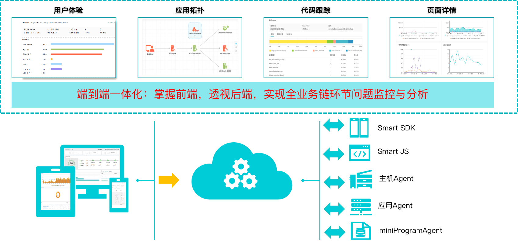 - 数据分析与展示层:该层主要提供了具体产品的相关功能。包括拓扑展示,请求分析、用户追踪,代码堆栈详情分析,网页性能分析,页面响应时间分析、可用率分析等相关功能。