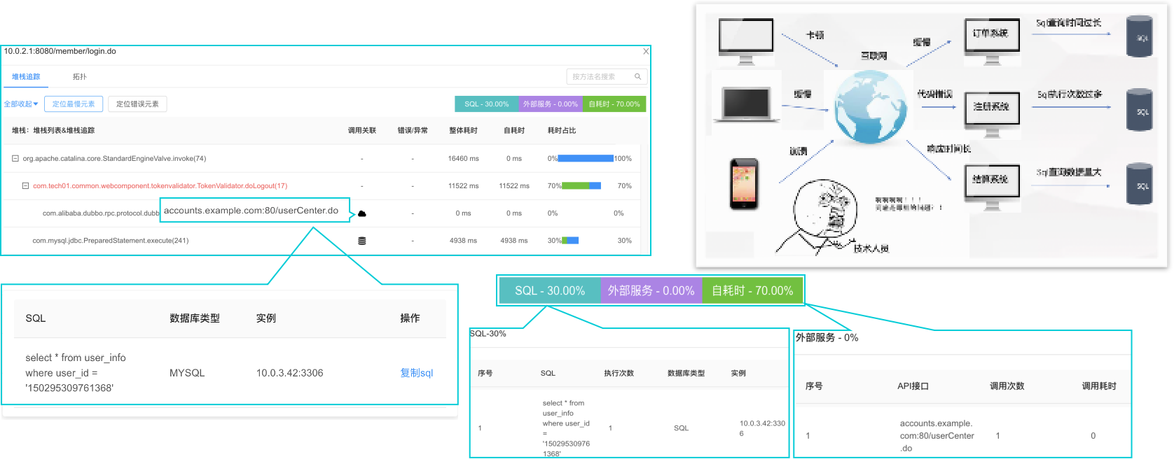 第二个场景是应用性能问题及故障快速诊断,使用人员通过拓扑发现问题后需要第一时间定位问题,产品提供简单直观的操作界面,在拓扑图上点击应用实例就可以快速跳转到详细问题分析界面,比如上面截图的内容,可以看到后台代码堆栈追踪,慢SQL语句、外部接口详情、自身耗时、请求参数等详细分析问题的指标,性能问题一目了解,问题定位运筹帷幄。