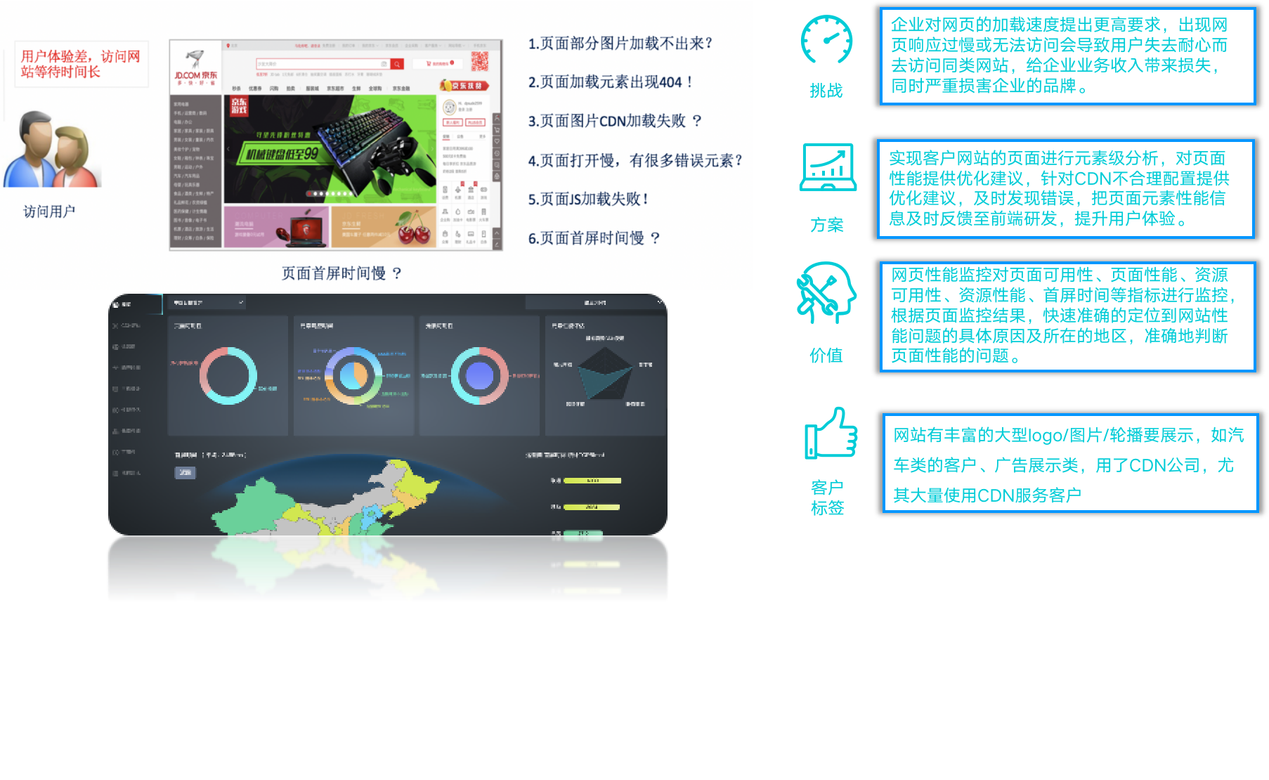 随着网站内容更加复杂化,大量元素加载耗时变长,首屏响应时间变得更加重要。如:当用户点击二级页面时会出现404错误或响应慢等现象,企业虽然做了 CDN 加速,在此情况下也很难确定加速的质量的好坏。然而在互联网时代下,用户对网页的加载速度提出更高要求,出现网页响应过慢或无法访问则会导致用户失去耐心而流失,以此便会给企业业务收入以及品牌均会带来损失。基于上述问题,监控宝产品提供了多页面脚本录制功能,可以模拟人点击操作所有页面各个环节的性能诊断,及时发现元素性能问题。此外,基于企业同时使用多家 CDN 厂商导致具体加速质量难以判断的现象,监控宝也提供了 CDN 整体性能评估功能,方便用户做 CDN 厂商性能体验对比。该场景主要应用在网站有丰富的大型logo/图片/轮播要展示的企业,如汽车类、广告展示类以及大量使用 CDN 服务商的企业。