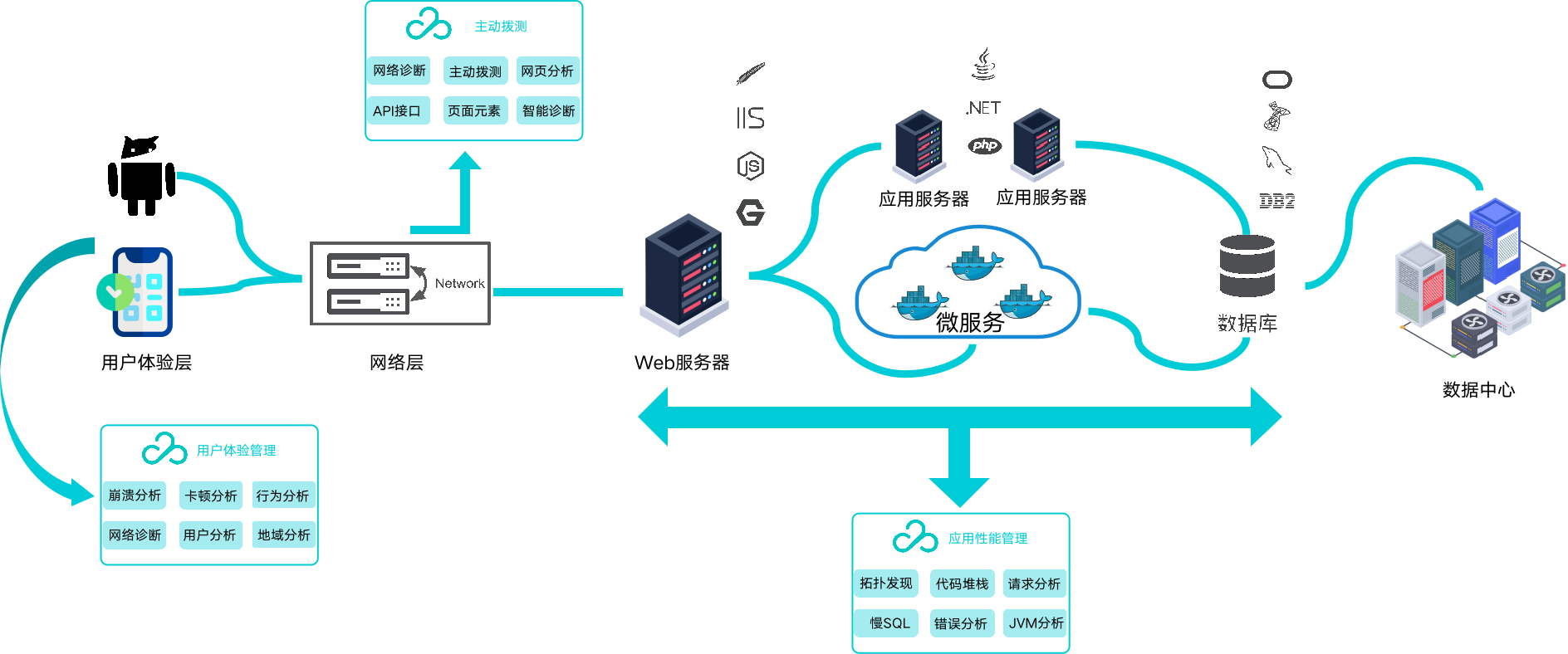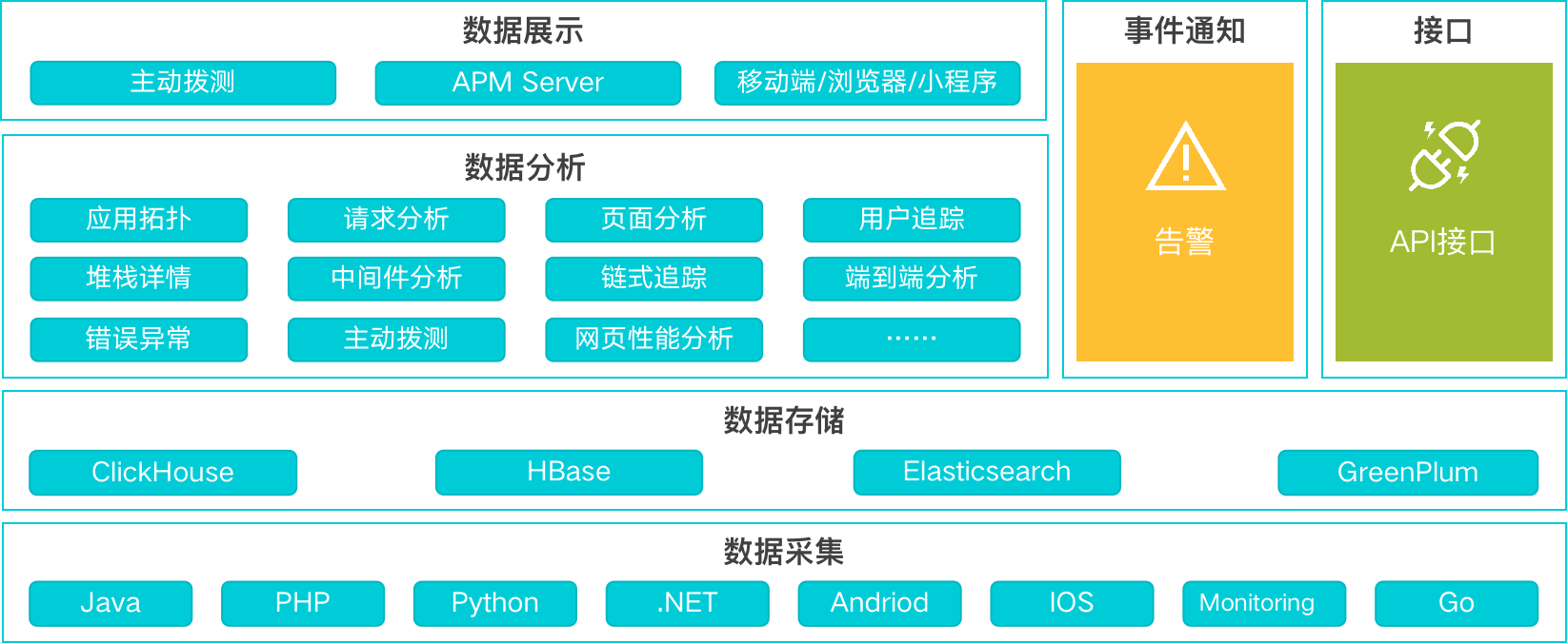 - 数据采集层:APM产品支持市面上比较主流的开发语言,如Java、PHP、Python等。APP端支持 android 和 iOS 等各种版本。依赖主动拨测,基于全球IDC实现Monitor数据监测。