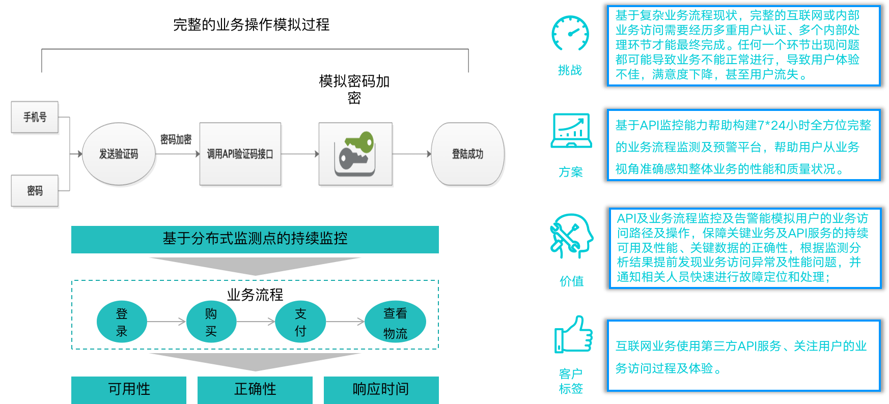 业务流程监测与优化主要解决业务调用第三方 API 接口性能问题。由于业务流程现状复杂性,完整的互联网或内部业务访问需要经历多重用户认证,以及多个内部环节处理才能最终完成。任何一个环节出现问题都可能导致业务不能正常进行,以及用户体验不佳、满意度下降,甚至出现用户流失。所以需要监控宝帮助企业从业务视角准确感知整体业务的性能和质量状况。该场景主要应用在使用第三方 API 服务的互联网企业、关注用户业务访问过程及体验的企业。