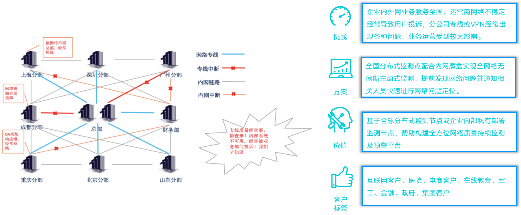 企业内外网业务服务于全国。运营商网络不稳定的用户投诉,分公司专线或 VPN 经常出现的各种问题,均会导致业务运营受到较大影响。 外网网络质量监测依托于云智慧在全球 IDC 节点提供主动的 ping、MTR、traceroute网络探测,60秒的探测频率可以让问题被及时发现。针对内网专线的监测,云智慧提供魔盒产品。类似机顶盒的小盒子,使用寿命长、无风扇设计、节能环保,直接部署在分公司数据中心机房中即可使用。该场景主要应用于医疗行业、电商、金融、政府军工等集团企业。