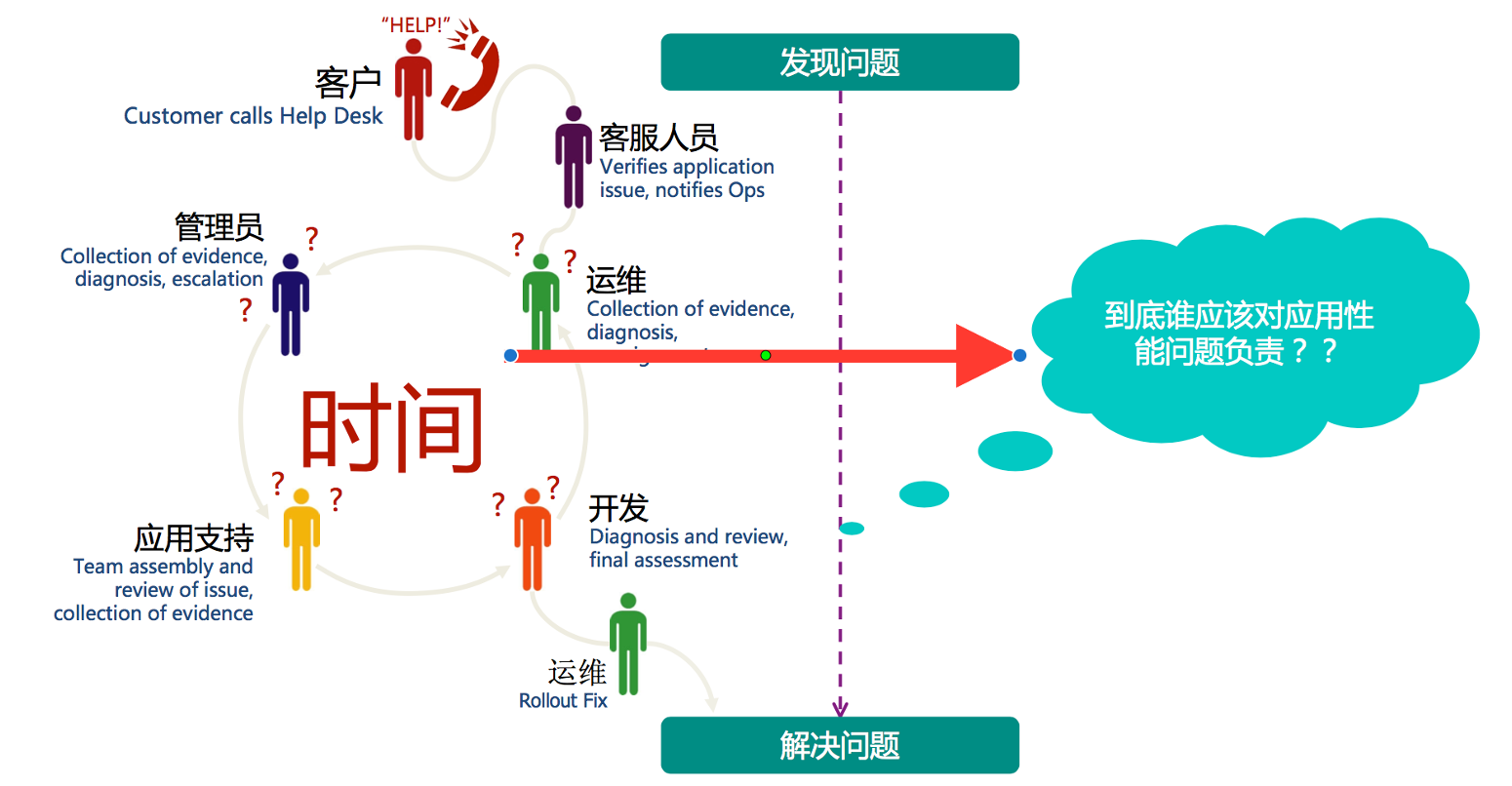 传统的监控工具早已无法满足当前企业面临的问题。因为一个应用会涉及到数据库、第三方的API 调用、应用服务器、中间件、Web、网络层等多个链路,因此,当系统慢是无法快速定位就是是拿个环节、组件以及指标导致。日常企业去判断上述问题时,会需要网络团队、开发团队、数据库团队、基础设施团队等多方协助排查,且排查效率较低。