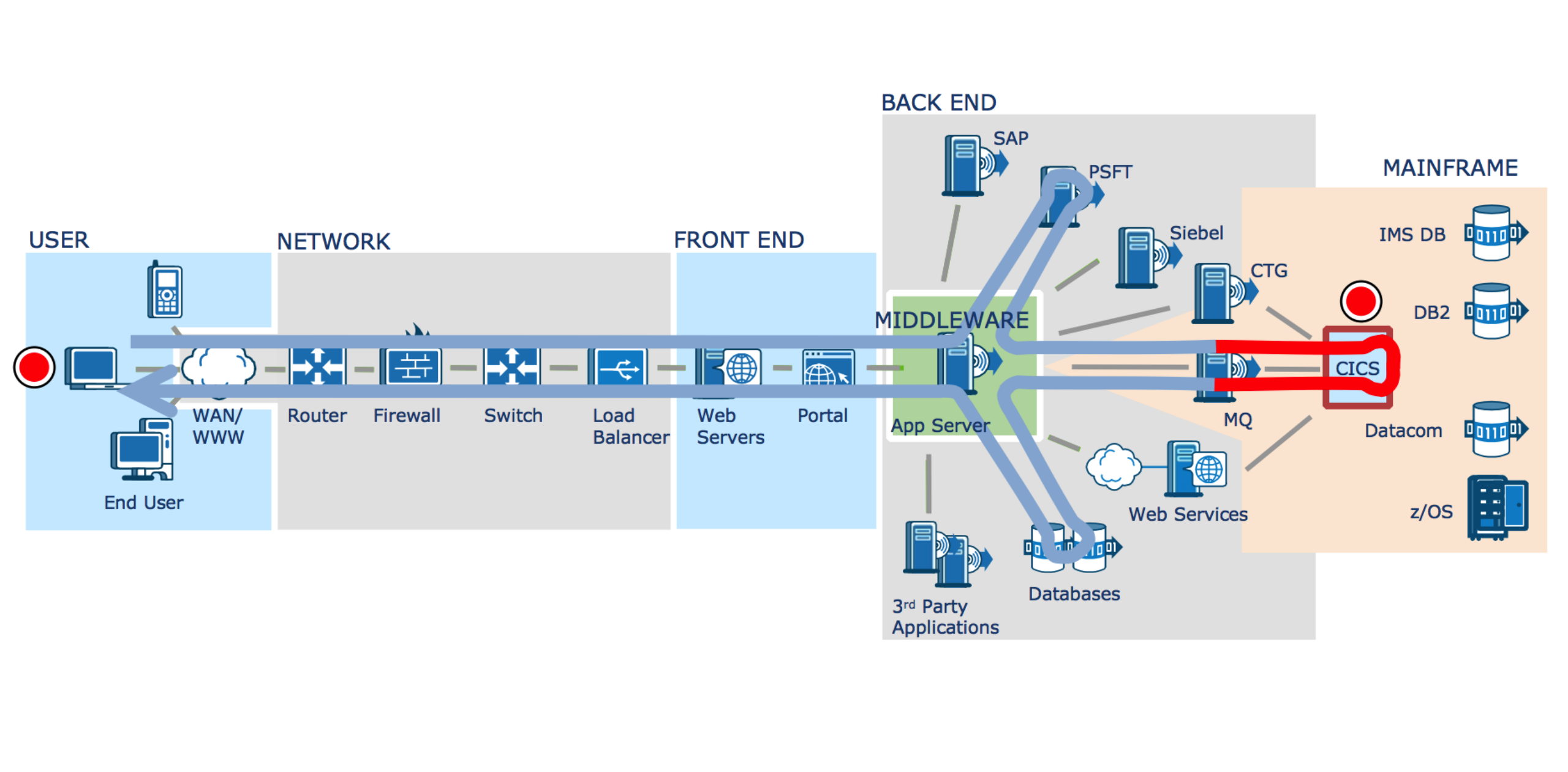 应用是一个端到端的多技术栈复杂整合环境,用户端包括移动端、浏览器、小程序,网络层包括路由器、防火墙和负载均衡等,后台支撑应用包括中间件、数据库、主机、MQ等。所以如何去高效精细化的实现整个应用端到端的全链路性能问题洞察和诊断、快速找到故障的边界、以及特别是VIP用户出现性能问题如何快速追踪。这些应用的复杂度是企业运维部门和业务部门都需要考虑的问题。