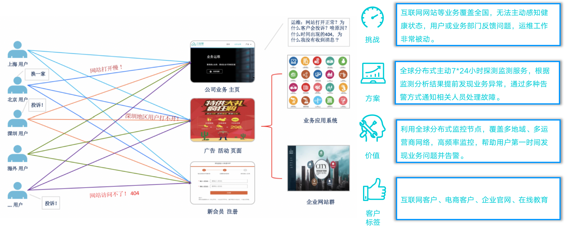 业务服务的持续监测和告警在一些互联网企业当中经常会遇见。比如北京区域网站访问是健康的,但其他区域网站访问异常时,也会收到的其他区域用户投诉。针对上述问题,由于目前各行业网站页面加载时序元素复杂,外加整个页面会有一些动画图片效果的呈现,所以需要能够实时探测网站在中国区域到地市级别和区级别的监控的主动拨测产品。监控宝可监测不同运营商链路访问网站速度、404相关错误,以及可通过IDC节点主动收集数据,帮助企业及时分析并主动探测业务问题。该场景主要应用于互联网企业,电商企业,还有企业官网、在线教育等行业。