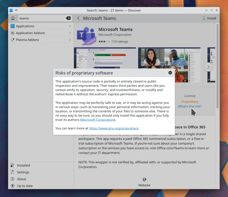 - Discover 现在将警告用户安装专有软件的风险:
