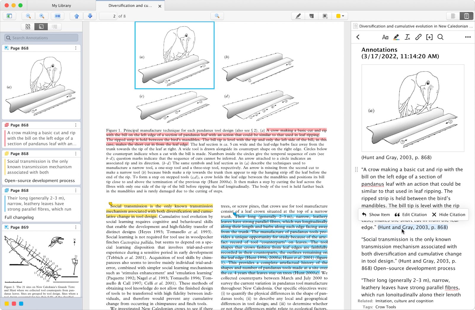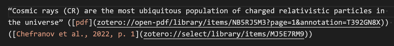 添加到笔记中的注释不仅仅是纯文本:它们包括有关 source PDF 的信息,让你快速跳回原始页面查看上下文,使用 Zotero 的文字处理器插件生成参考书目条目,切换注释的颜色,在导出到 Markdown 时包括返回 Zotero 的链接,甚至恢复意外删除的引文以确保你已经正确归属了一个引文。