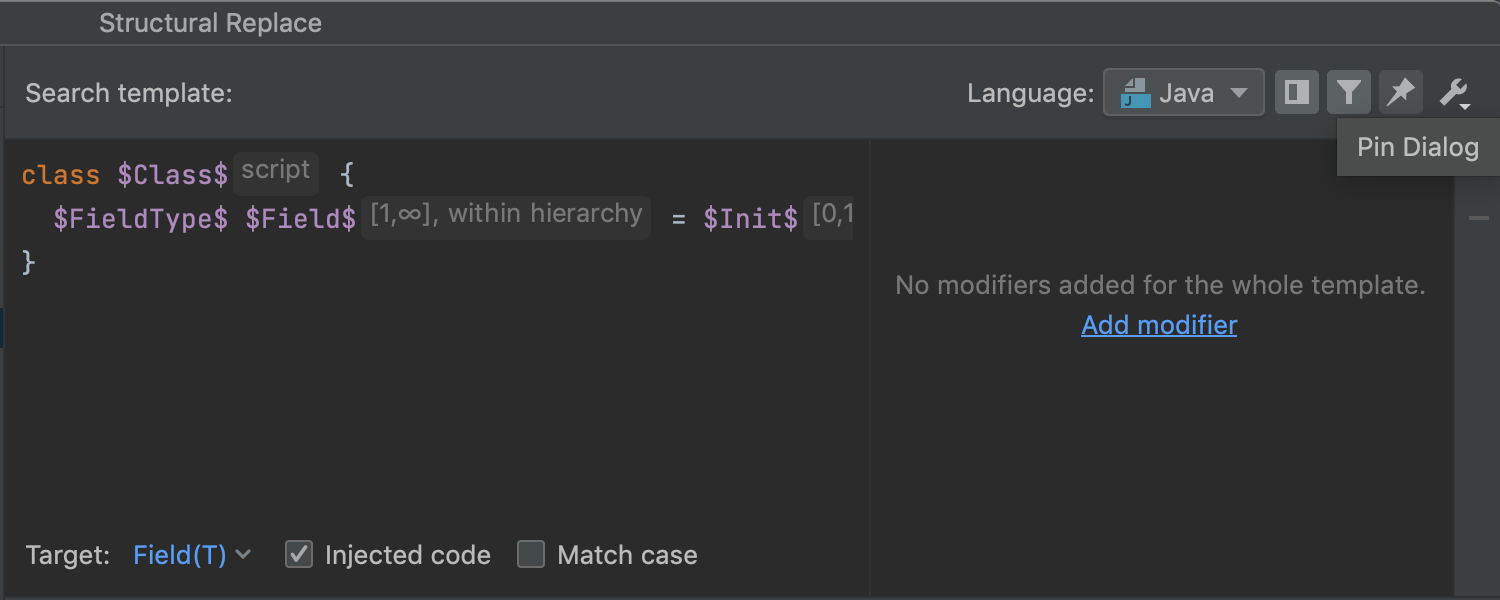 此外还在结构搜索和替换对话框的右上角添加了 Pin Dialog 图标,并将 Injected code 和 Match case 复选框移至Search template 窗格的底部。