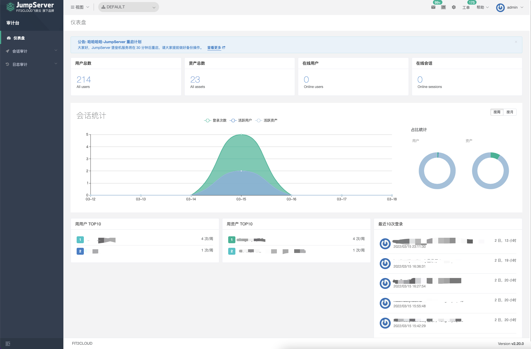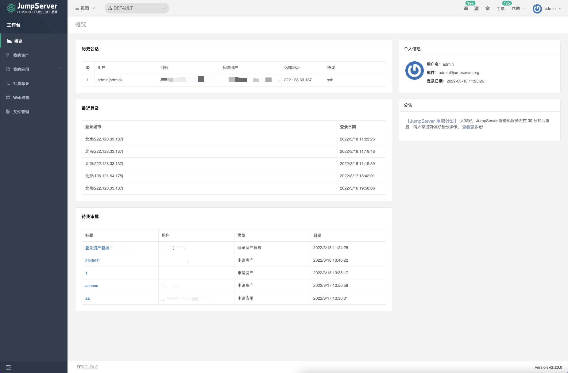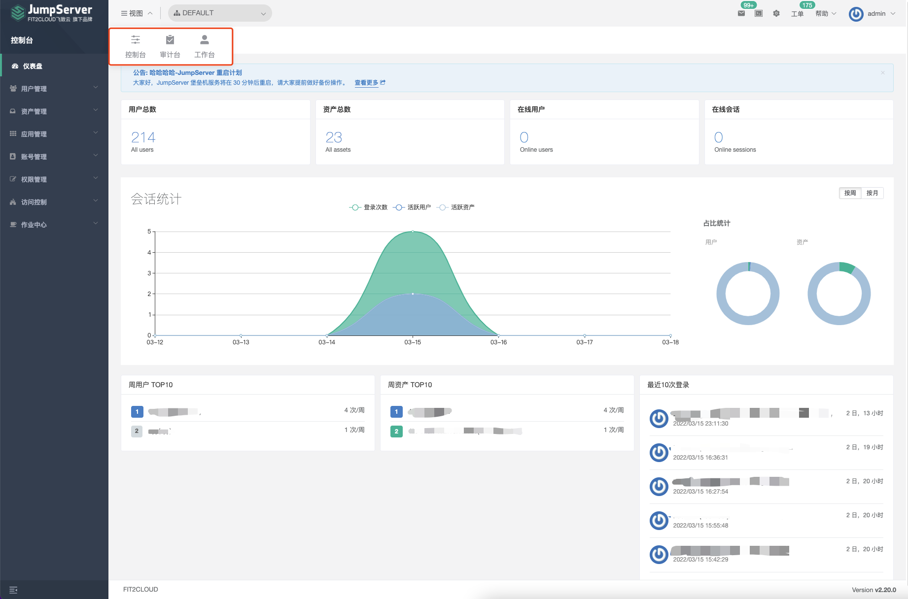 在JumpServer v2.20.0版本中,我们对UI界面进行了重要优化,将视图划分为:控制台、审计台和工作台,进一步提升了用户的使用体验。