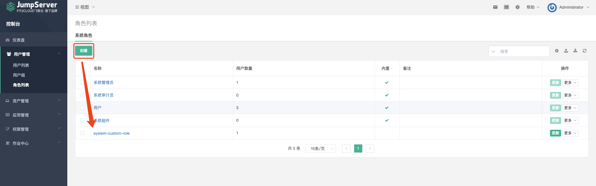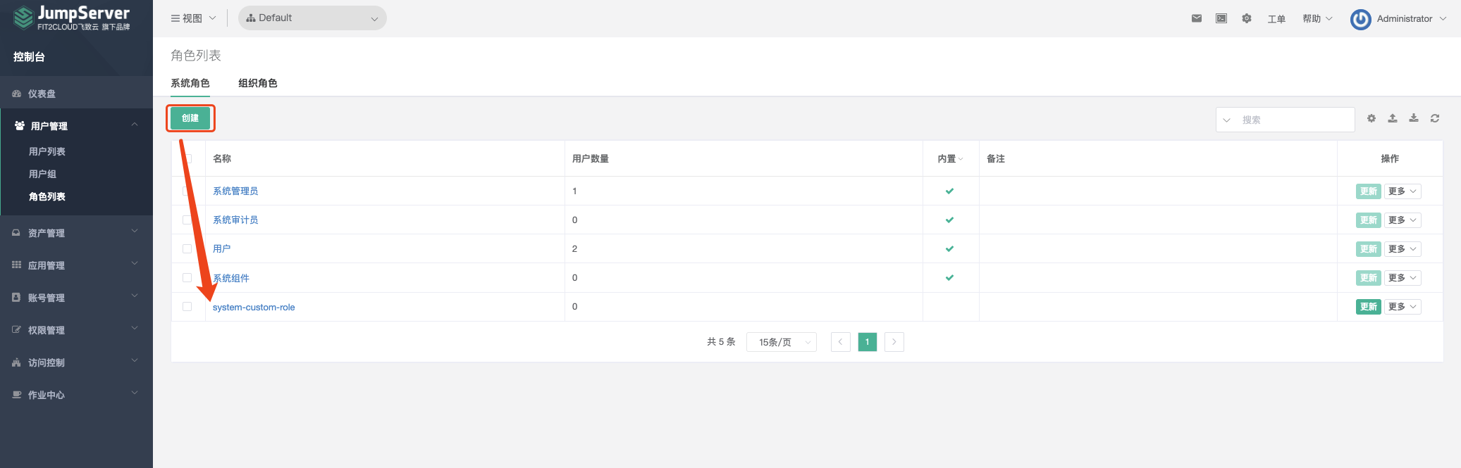 JumpServer社区版的角色列表是系统角色列表。默认保留原有的三种系统角色:系统管理员、系统审计员和用户,兼容用户旧版本的角色体系,同时支持系统管理员自定义角色。