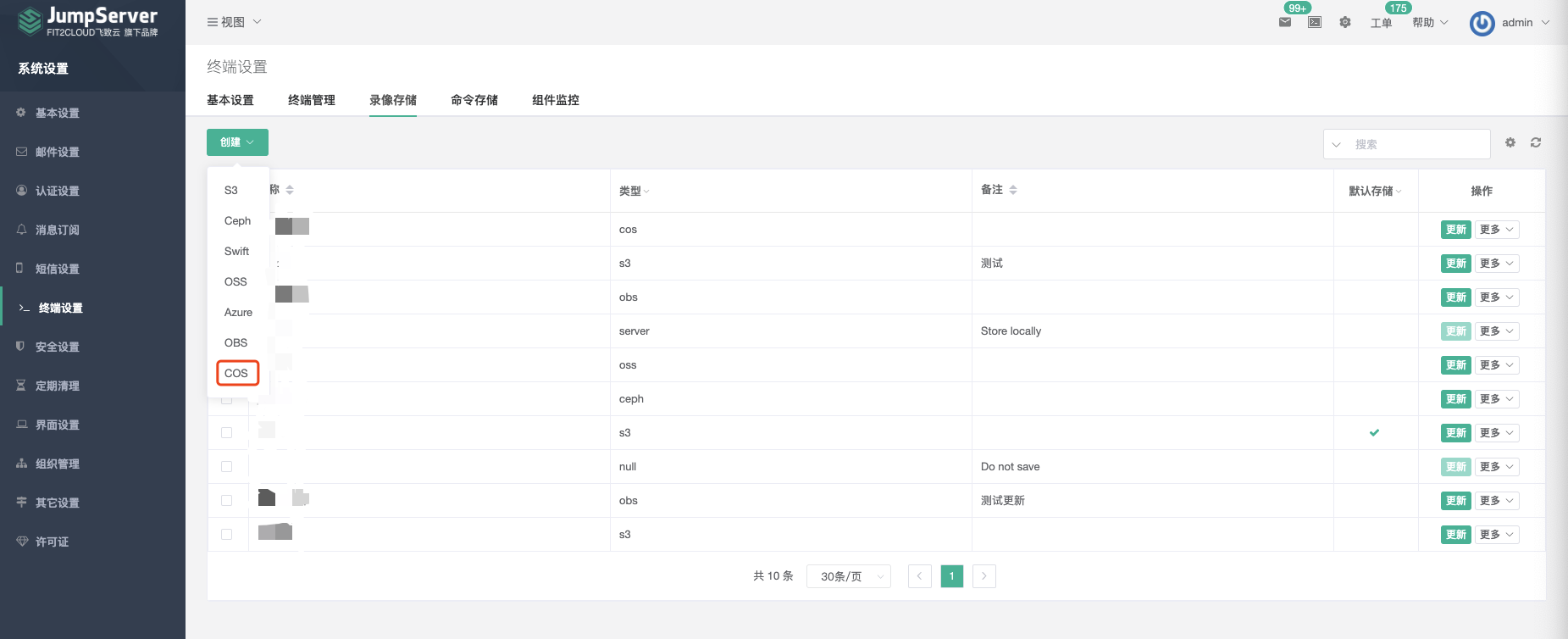 在JumpServer v2.20.0版本中,新增支持腾讯云对象存储(COS)。目前,JumpServer支持的对象存储有Amazon S3、Ceph、Swift、阿里云OSS、Azure、华为云OBS和腾讯云COS,满足了更多用户的使用需求。
