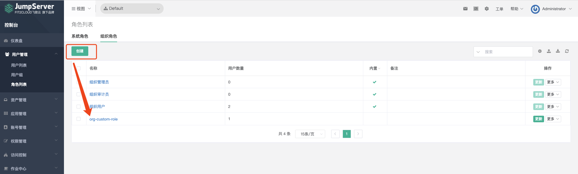 ▲ 图4 在JumpServer企业版中选择“用户管理”→ “角色列表”→ “组织角色”,创建自定义组织角色