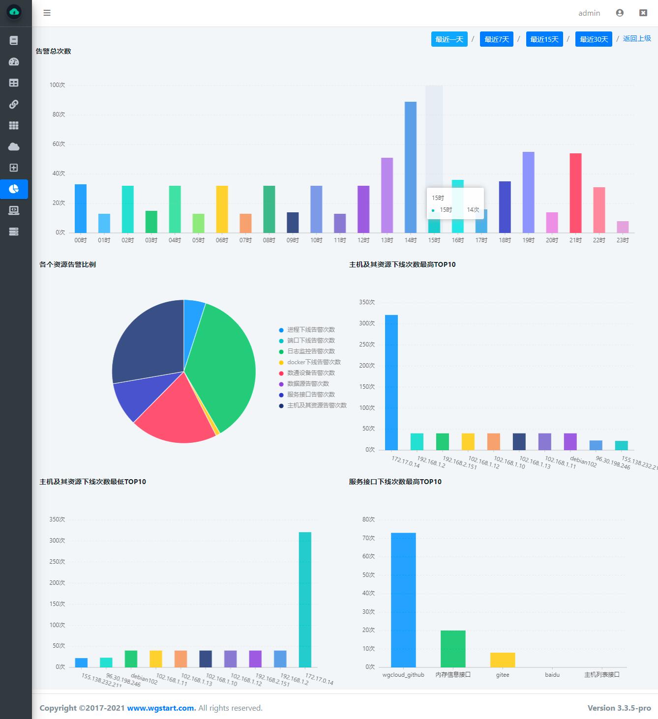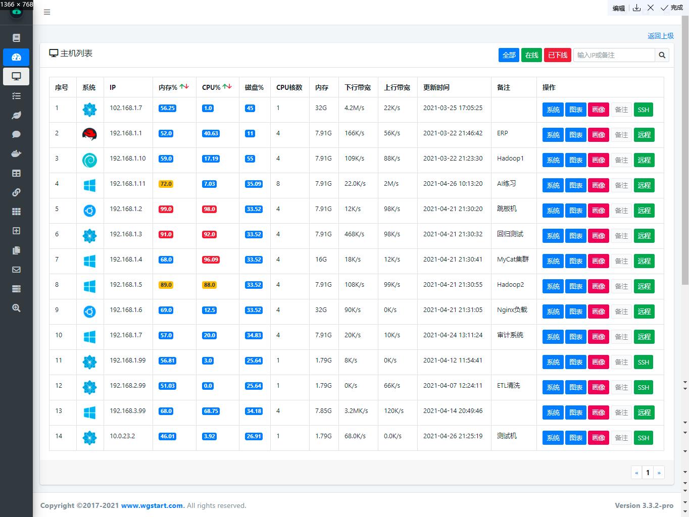 WGCLOUD是一款集成度较高的分布式运维监控系统,具有集群监控,易部署、易上手使用、轻量、高效、自动化等特点,server端基于springboot开发,agent端使用go编写。核心模块包括:主机系统信息监控,CPU监控,CPU温度监控,内存监控,网络流量监控,磁盘IO监控,磁盘空间监测,系统负载监控,硬盘smart健康检测,应用进程监控,端口监控,docker监控,日志文件监控,文件防篡改保护,数据可视化监控,自动生成拓扑图、大屏可视化,数通设备监测,服务接口监测,web ssh堡垒机,指令下发,告警信息(邮件、钉钉、微信等)推送。