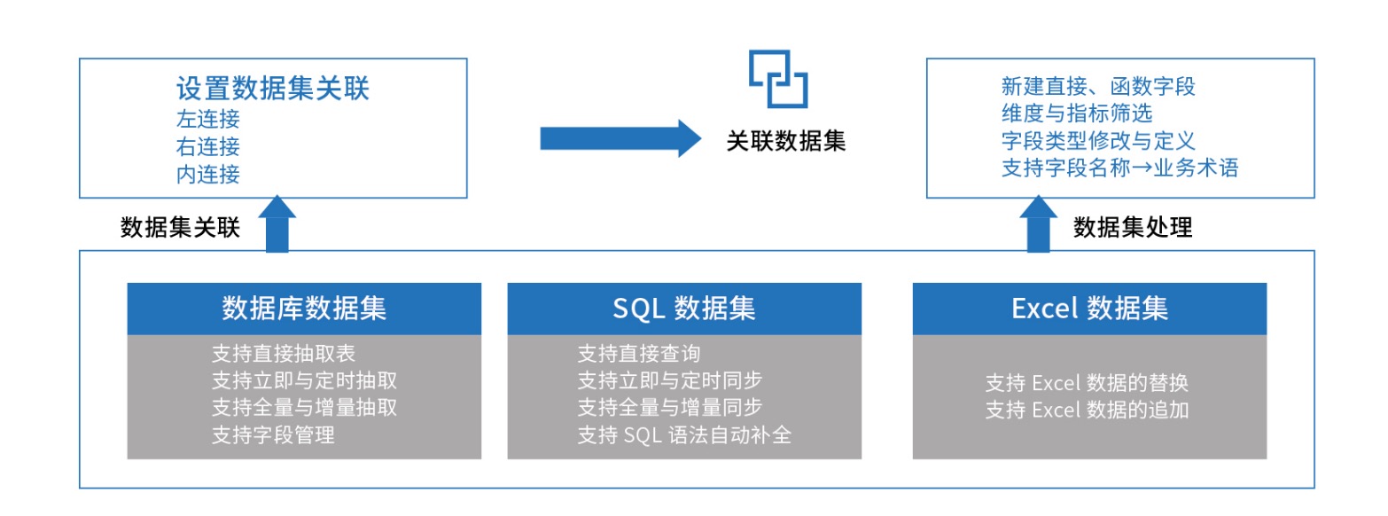 DataEase关联数据集的步骤如下图所示。采用多数据集间关联关系的构建,以及通过对数据集字段的选择展示组合完成,更易理解,也更加方便使用。在DataEase中,对于宽表的操作主要就是利用关联数据集来创建和生成。