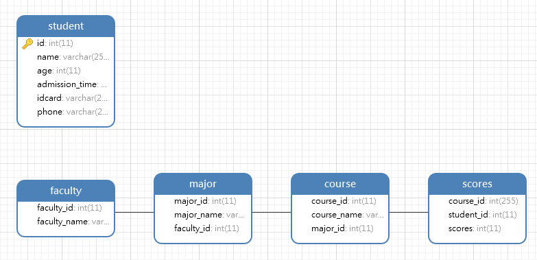 ⑥ 依此类推,可以设置课程表和专业表的关联关系,以及专业表和学院表的关联关系。