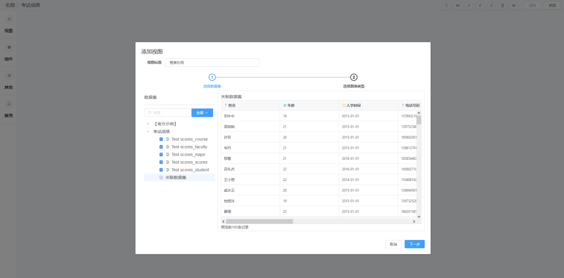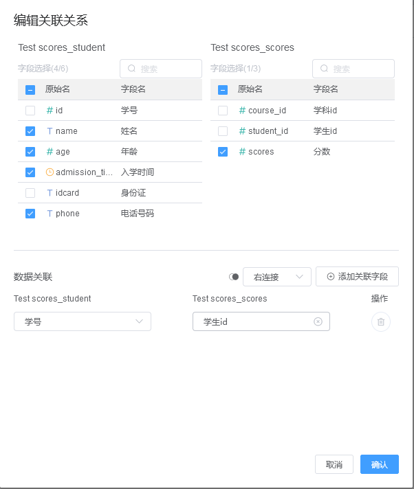 第四步:创建关联数据集。将数据库数据集中的五张表以学生表开始,采用右连接的方式一一关联。