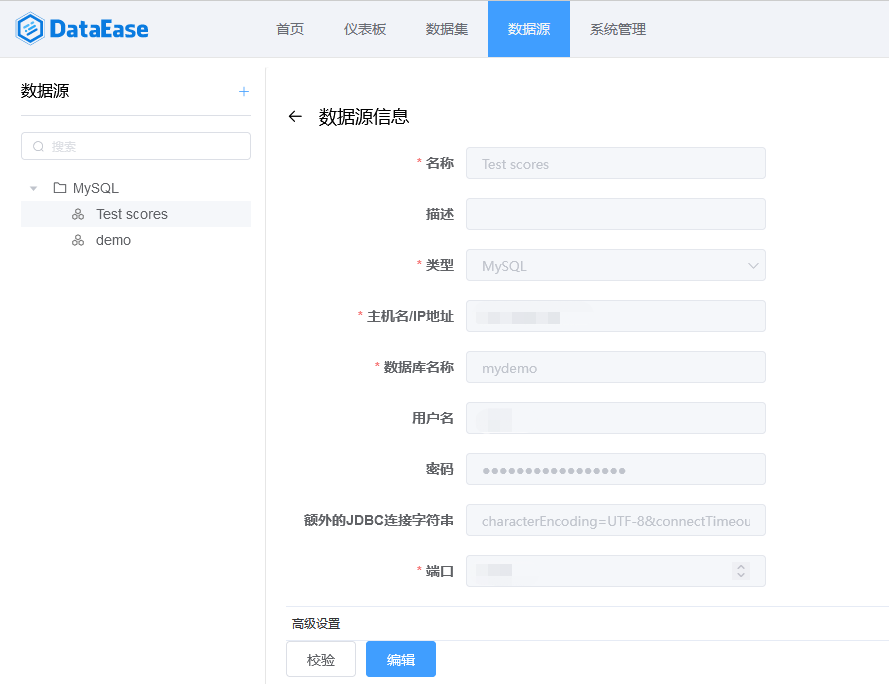 第一步:接入数据源。将原生数据导入MySQL数据库中(demo.sql),在DataEase数据源中接入MySQL数据源,如下图所示:
