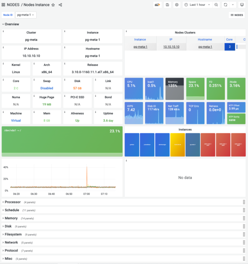 Pigsty v1.4 引入了一个全新的功能:节点监控,这也是模块化改造的一个直接成果。这并不是说以前Pigsty没有关于机器节点的监控指标,而是在以前,机器的监控指标是1:1与PostgreSQL实例绑定的。对于一个PostgreSQL数据库发行版来说,这样的设计是没有问题的。但随着Pigsty的发展,这样的设计就开始显得不合时宜了。