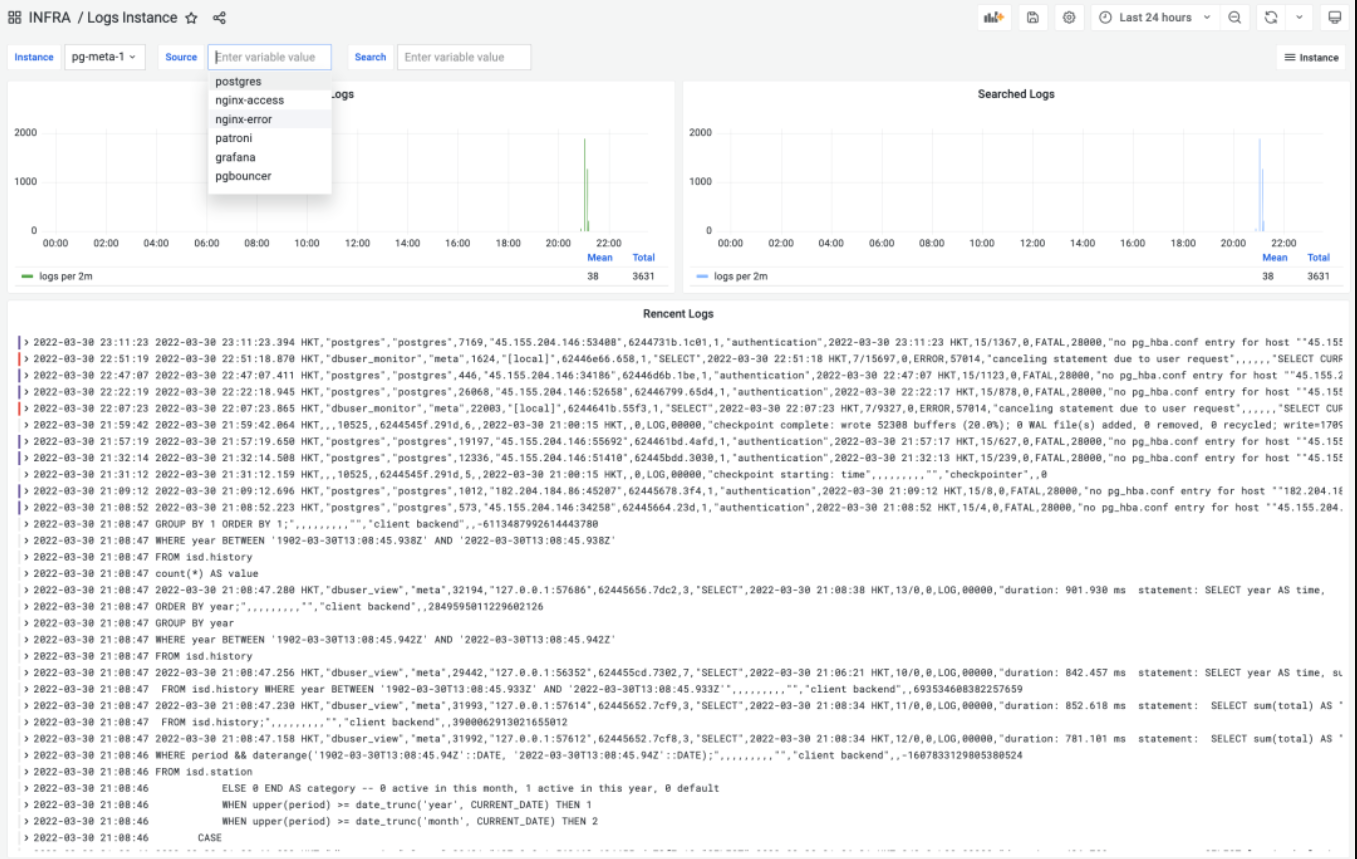 INFRA板块的 LOGS Instance监控面板,可以实时浏览搜索所有日志。