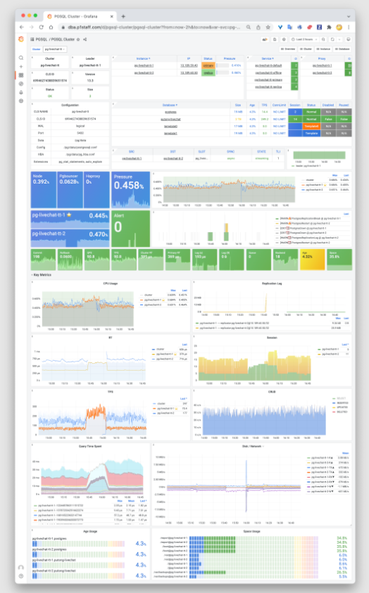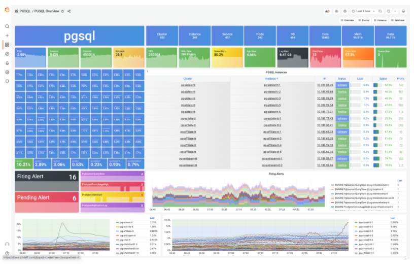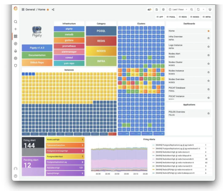 - Pigsty集成了完整的大规模数据库监控管控解决方案:Grafana,Prometheus,Loki,Ansible,CMDB。亦可作为生产级应用运行时直接使用,监控管理其他数据库与应用。
