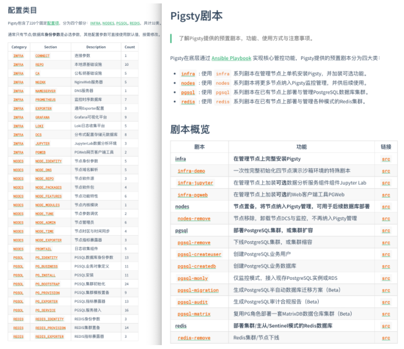 Pigsty 1.4 在模块化上进行了大量的工作。无论是配置项,命名空间,剧本,标签,监控面板,全部按照这四个模块进行分类统筹。例如,下面是按照模块划分的剧本与配置项: