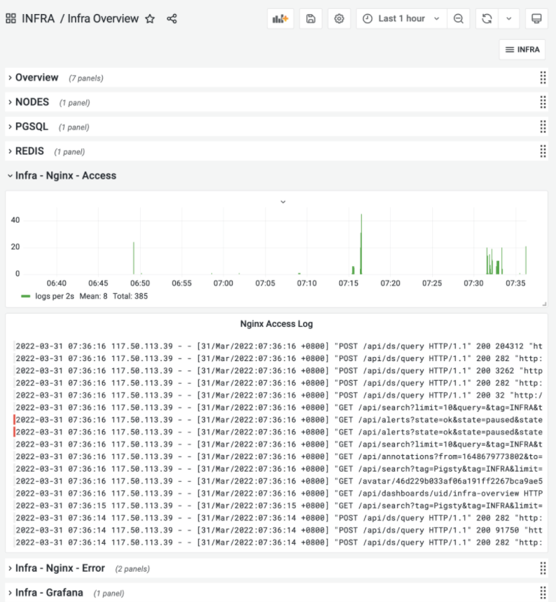 在Pigsty 1.4中,Loki与Promtail日志收集组件升级为整个系统的默认组件。Loki是Grafana出品的日志收集方案,采用与Prometheus类似的标签体系,与PromQL类似的LogQL。是一个轻量化,优雅简洁的日志收集、处理、分析解决方案。经过了一年时间的测试与打磨,现在Loki已经成为了Pigsty的默认组成部分。会实时收集各式各样的日志:节点的syslog, dmesg, cron日志,数据库postgres/pgbouncer/patroni的日志,以及Redis日志。