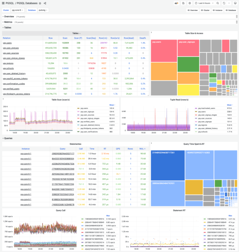 第二个显著改进是新增的 PGSQL Databases 面板。在过去,数据库内监控只关注单个实例内的单个对象。但对于表、索引这样的业务对象,我们更关注的是它们在整个集群内的整体指标。PGSQL Databases面板为此而生。您可以查询某一个数据库在整个集群内的表现,水平对比集群间不同实例的差异: