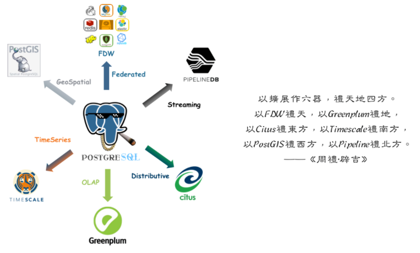 PostgreSQL是一个相当全能、相当完美的数据库内核了,但正所谓:红花还需绿叶配,一个好汉三个帮。当组织与数据成长到一定规模后,使用专有数据组件的需求也会随之出现。最典型的两类是:以Redis为代表的缓存,以及以Greenplum为代表的数据仓库。