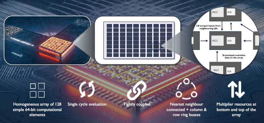 在了解背景信息后,我们与Foley聊了Ascenium正在研发的处理器,它并没有如我们熟知的那样有一个指令集,而是试图通过Aptos处理器重新定义软件编译器和底层硬件之间的接口。Aptos处理器是一个由64位计算单元组成的可编程阵列。下面是一个大概的结构图,有点模糊,因为Ascenium目前还比较神秘。