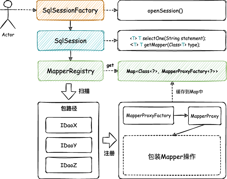 以包装接口提供映射器代理类为目标,补全映射器注册机 MapperRegistry,自动扫描包下接口并把每个接口类映射的代理类全部存入映射器代理的 HashMap 缓存中。 -