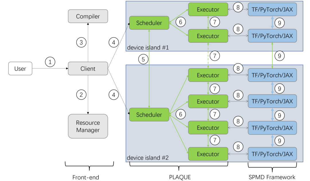 第④步,Client 把编译生成的底层表示转换成一个能被 PLAQUE 识别的数据流图(dataflow graph),并发送给运行时(runtime)系统去执行。Pathways 运行时系统缺失很多细节,特别是依赖于一个语焉不详的闭源系统 PLAQUE,这是一个谷歌内部使用的、闭源的数据流执行引擎。