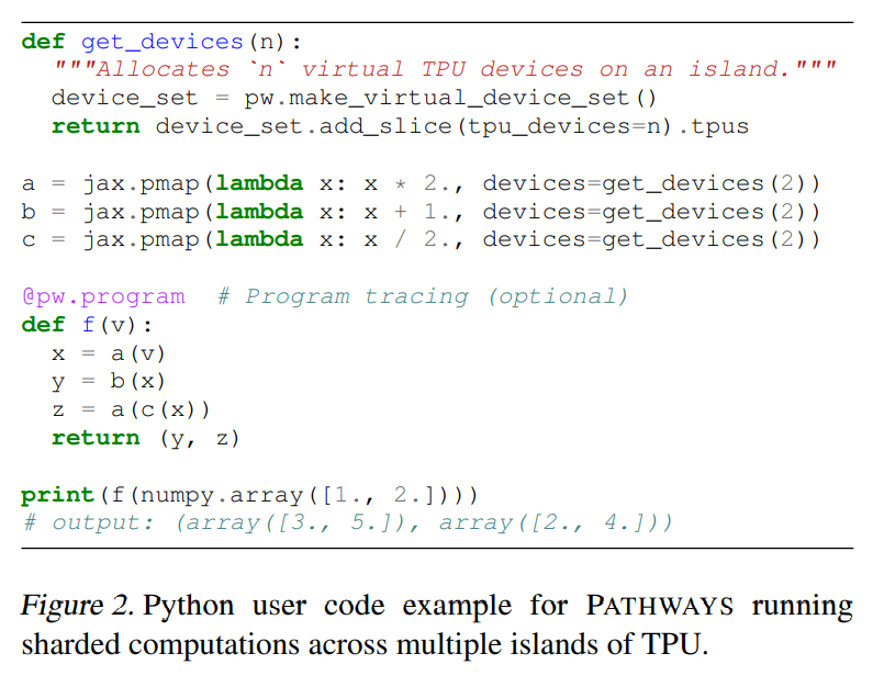 PATHWAYS uses a sharded dataflow graph of asynchronous operators that consume and produce futures, and efficiently gang-schedules heterogeneous parallel computations on thousands of accelerators while coordinating data transfers over their dedicated interconnects. (Abstract)