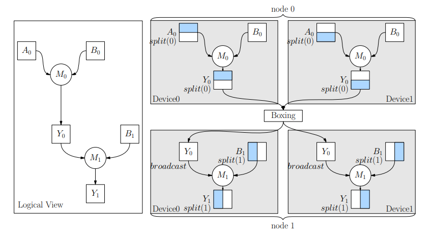 其实 OneFlow 早已用了这个想法,用 global tensor 表示逻辑张量,用 local tensor 表示物理张量,通过 SBP 实现了逻辑和物理表示之间的转换规则。