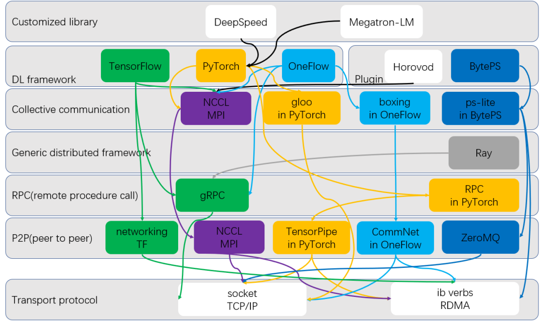 第二个问题,如上图所示,Ray 主要使用 gRPC 通信,缺乏对 NVLink 和 RDMA 的支持,也缺乏集群通信的支持。不过,Ray 在积极向深度学习系统领域发展,他们也意识到了这个问题,已开展各种增强 Ray 通信功能的工作,包括让 Ray 支持高速集群通信(https://arxiv.org/pdf/2002.05814.pdf)。对这个问题感兴趣的朋友可以阅读《对抗软件系统复杂性③:恰当分层,不多不少》。