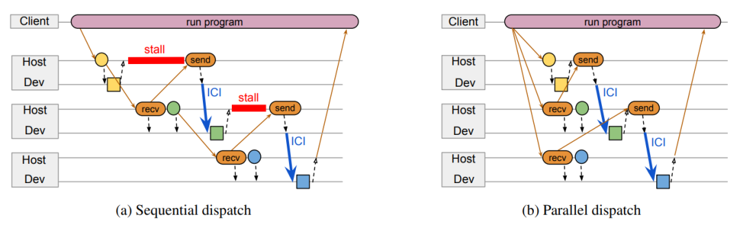 怎么解决这个问题?核心洞察是:大部分深度学习模型都是静态的,下游输入对应的张量形状都可以在编译阶段提前获得,不需要等到上游任务异步入队列那一刻。因此,如上图(b)所示,Pathways 用了所谓的并行异步分发,基于 compiled function 提前可知的、静态的资源需求量的事实,提前启动 host 上的工作,譬如上图中的 recv 就被提前启动了。