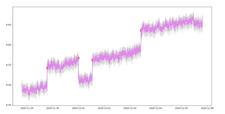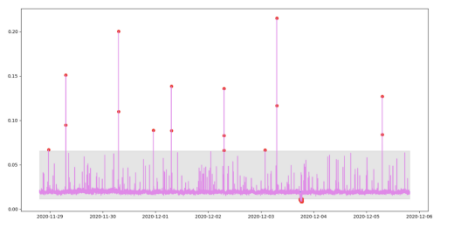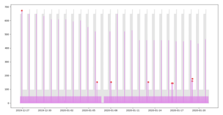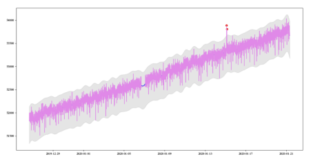 一般针对基础监控指标里面的内存使用量、磁盘占用量经常会出现变更数据,变更数据的特点是一段 时间 内变化不大,由于内存或是磁盘突然上升导致出现更变点(change point),或者是中间件指标的队列堆积数量等因素,针对这种变更数据,首先推荐使用Tima算法,其次推荐使用频域分析算法。此处推荐使用Tima算法是因为同样的数据量,Tima的执行效率高,执行时间约为0.083s,而使用频域分析的执行时间约为46s。如下图分别是Tima算法和频域分析算法计算变更数据的结果。