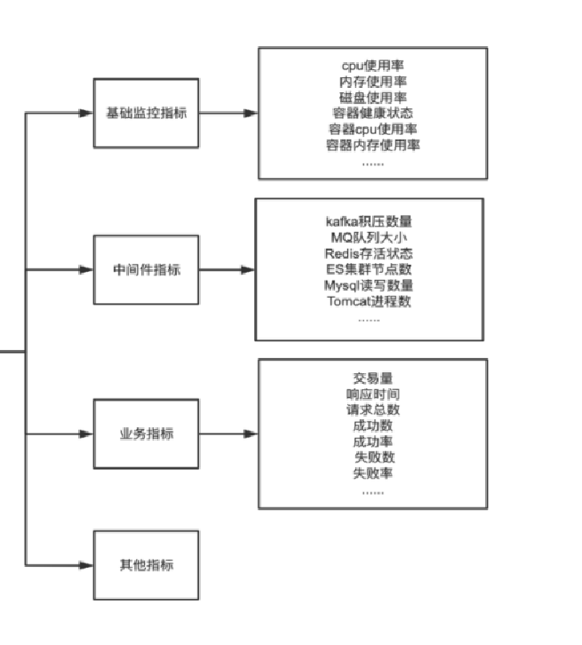 不同企业都有其各自的指标,这些指标可以大致归类为基础监控指标、业务指标、中间件指标以及与自身业务具有直接联系的指标等,如图1所示。基础监控指标,如cpu使用率,内存使用率,内存空闲率,磁盘使用率,磁盘空闲率等;中间件指标,如kafka堆积数量,Mysql读写次数、Redis存活状态、守护进程总数、打开文件数等;业务指标,如交易量、响应时间、响应率、成功率、错误率、请求数等;还有一些与业务直接相关的其他指标,如银行的跑批时长,券商的交易量等。