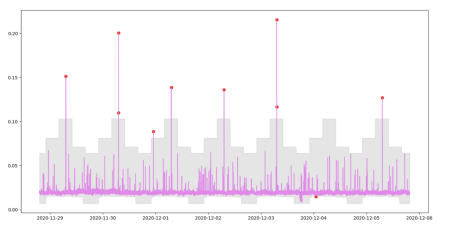 周期闲忙时数据一般会出现在基础监控指标的内存使用量,或者是与自身业务直接相关的指标上,如金融领域的证券市场交易量会出现这种周期闲忙时数据。闲忙时数据的特点表现为“忙”时数据值较大,“闲”时数据值较小,异常值常出现于“忙”时的数据,相对于历史“忙”时数据值过大或过小,以及“闲”时的数据相对于历史“闲”时数据值过大或过小。针对周期闲忙时数据进行异常检测时,推荐使用分段阈值算法。如下图是分段阈值算法计算周期闲忙时数据的结果。