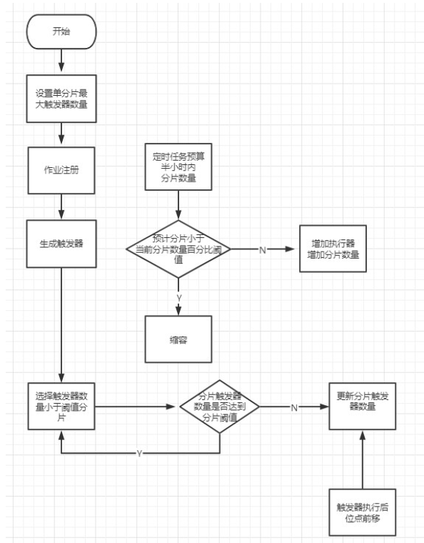 执行器负载监控服务:在CloudJob平台中每个执行器会处理一个数据分片,执行器负载监控服务会将作业划分到不同分片,分片内作业数量将维持在合理的数量范围,保证作业按照时间规则发送而不延迟。该服务负责分片的作业容量管理以及分片扩缩容等功能。