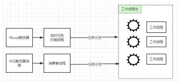 定时任务扫描线程:主要负责定时拉取触发器,随后均衡投递到对应时间轮中,一个时间轮由一个工作线程负责处理。如果出现工作线程处理时间轮中作业比较慢,出现大量堆积的情况,需要将对应分片属性设置为饱和状态,此时不会有新的作业被分配到该执行器,直到该分片重新恢复为非饱和状态。