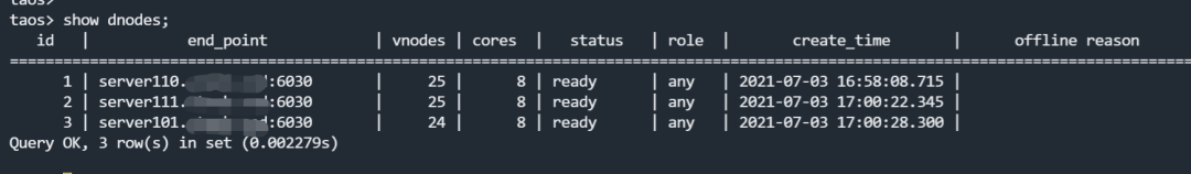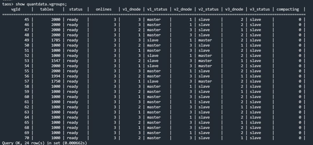这里大家需要注意,三节点并不代表三副本,也并不代表你的数据库已经具备了高可用性。数据库的高可用是在"create database xxxx replica 1/2/3"的过程中指定的,但是如果你忘记了也没关系,后期可以通过"alter database xxxx replica 1/2/3"来动态地进行调整。TDengine 会自动复制出一批分片(Vnode),并均匀地分布在各个节点之上,效果如下"show 库名.vgroups"所示。