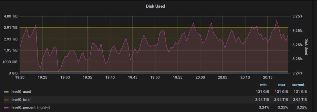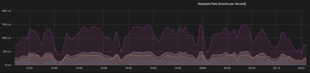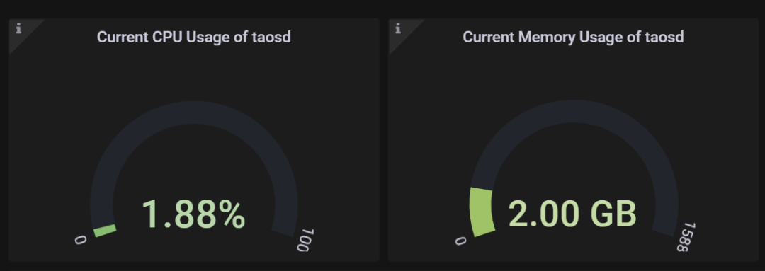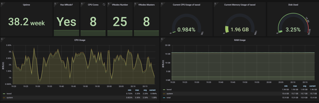 以下就是 Grafana 展示界面的一部分,可以看到,在当前并发写入的规模下(每秒 1 万-1.5 万行),CPU 资源占用率只有 1.88%,内存占用只有 2G。尽管目前我们使用的是三台 8 核 16G 的机器,但却可以在相当长的时间内不用再担心硬件资源问题了。
