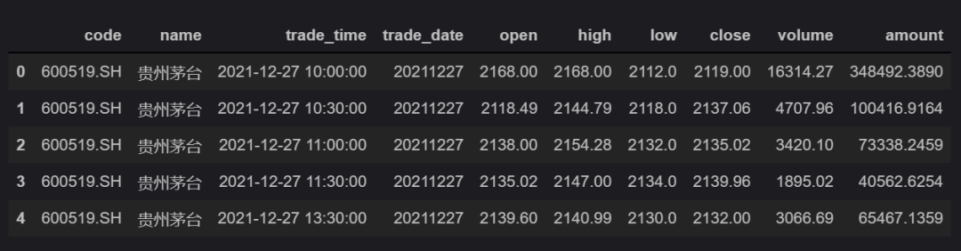 下图为用 1 分钟的 bar 数据合成 30 分钟的 bar 数据,查询出的茅台股票在一段时间内的开盘价、最高价、最低价、收盘价。